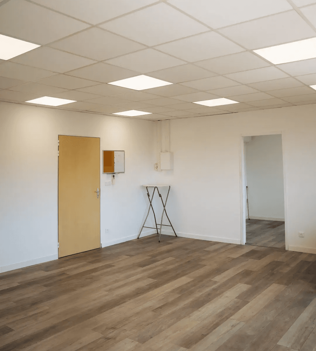 Un grand bureau traversant, baigné de lumière naturelle grâce à ses fenêtres, et climatisé pour un confort optimal toute l’année. Le sol en stratifié bois neuf et le faux plafond avec éclairage LED créent une ambiance sobre et moderne.